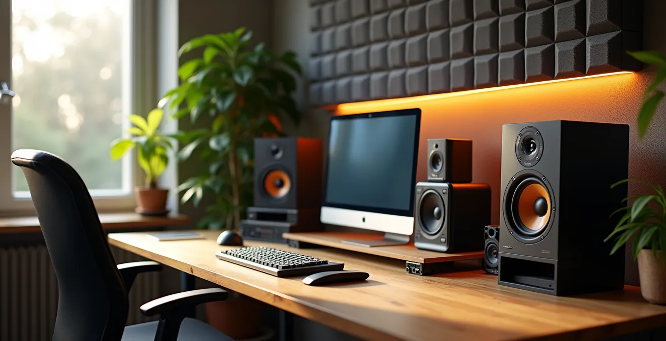 L’éclairage de votre home studio est souvent le grand oublié de l’ergonomie. Pourtant, son influence sur votre humeur, votre concentration et même votre perception auditive est profonde. Une lumière trop agressive, un simple plafonnier blafard, peut générer de la fatigue oculaire et un sentiment d’oppression, tandis qu’un éclairage soigné peut transformer votre espace en un cocon créatif. L’enjeu n’est pas seulement esthétique, il est psychologique.